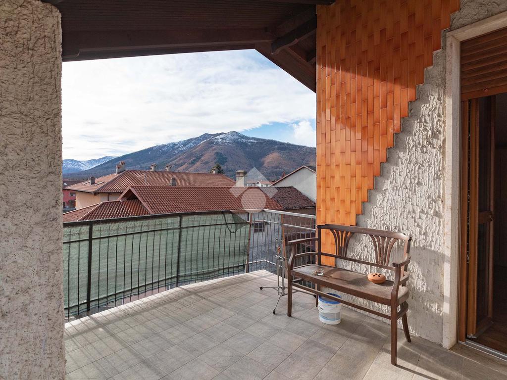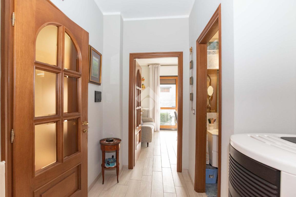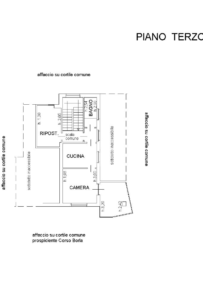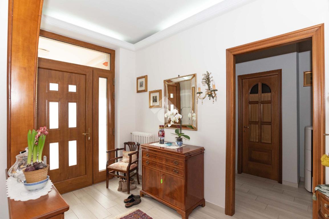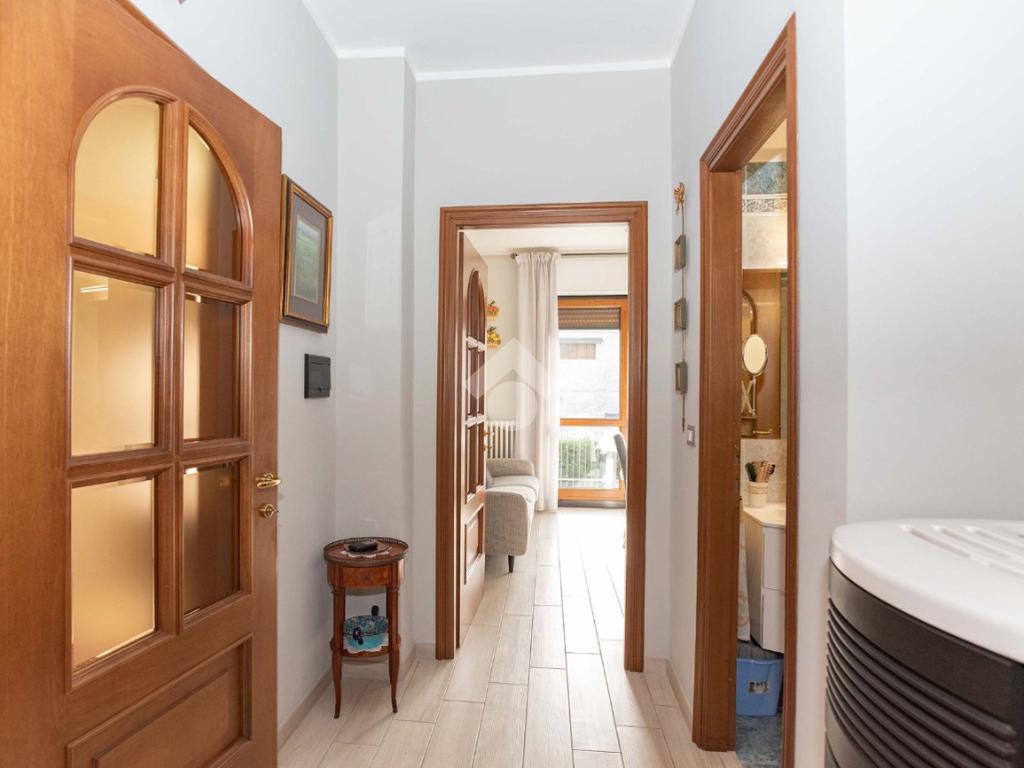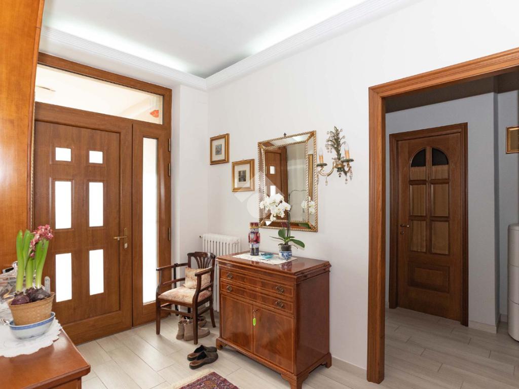 Il piano centrale è composto da un ampio ingresso, salone, cucina, due camere dalle generose dimensioni e dal bagno corredato di doccia; la soluzione è circondata da due balconi e da un terrazzino.