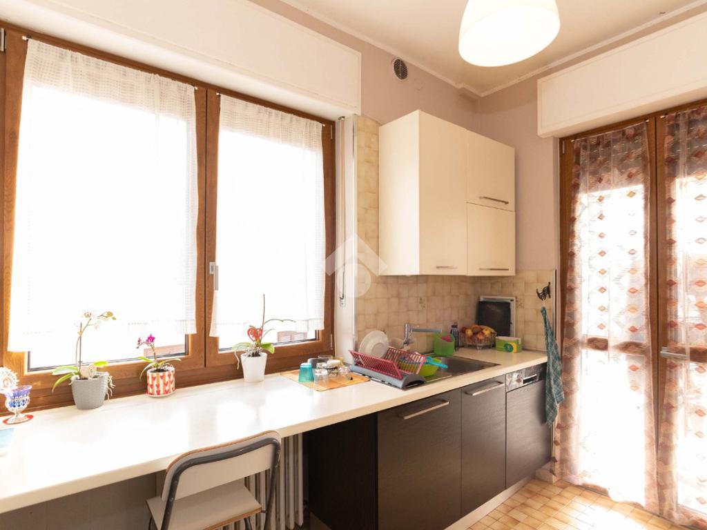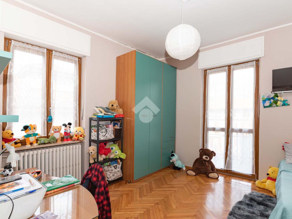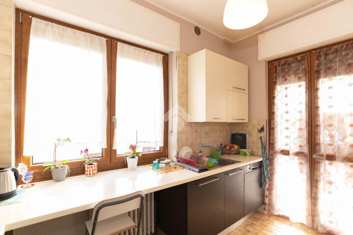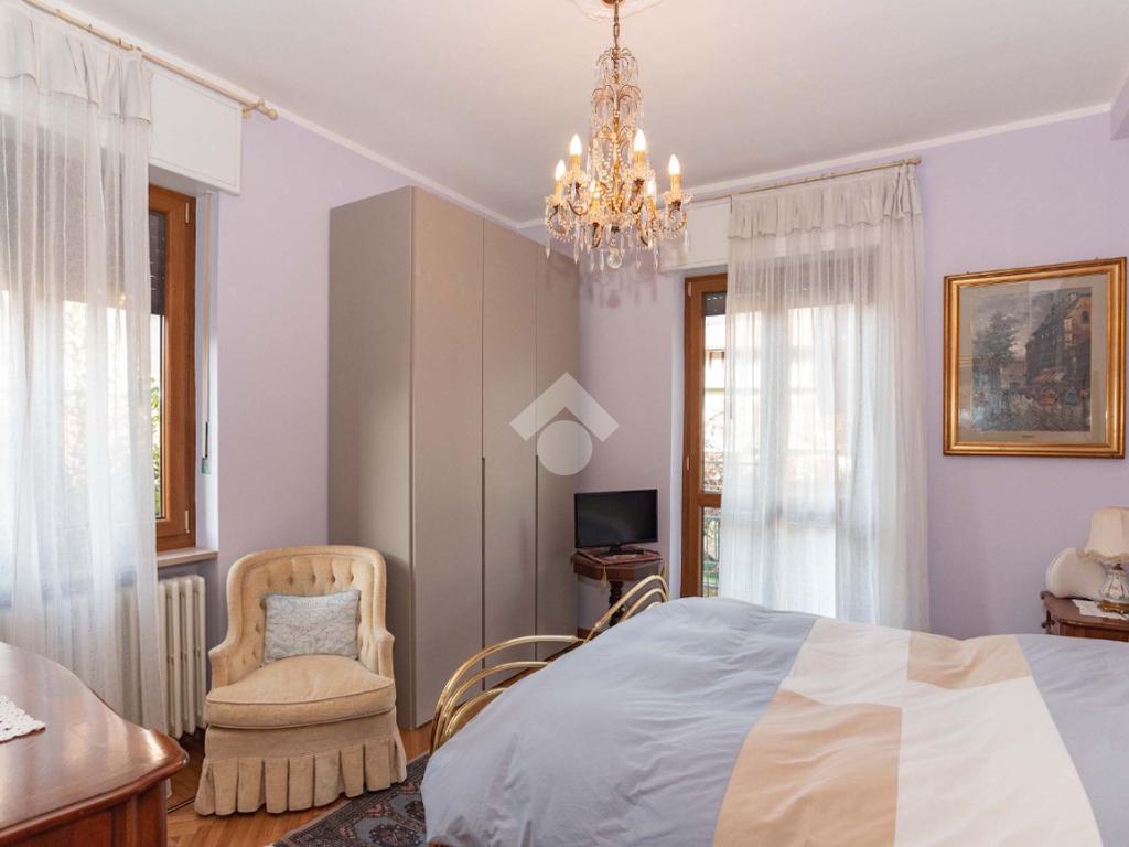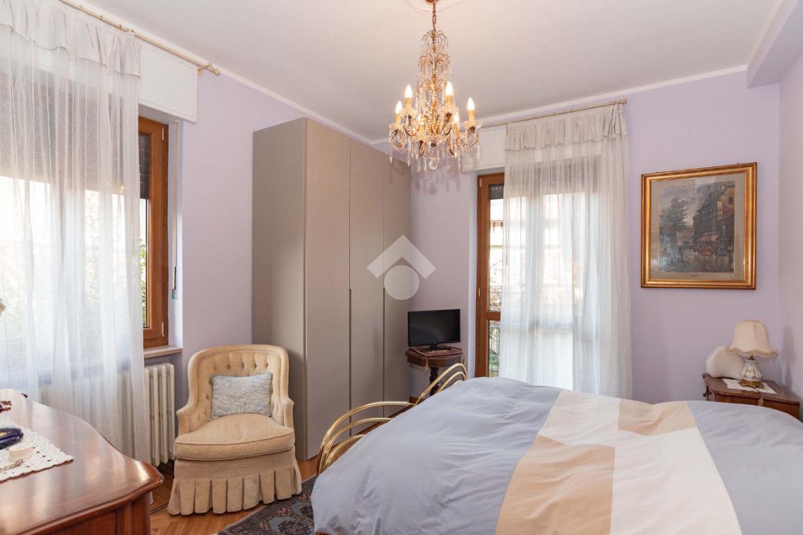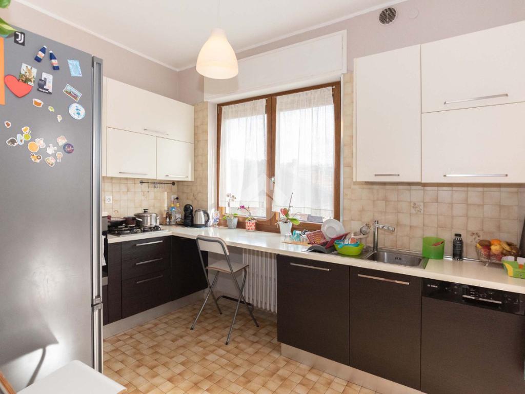 Il piano centrale è composto da un ampio ingresso, salone, cucina, due camere dalle generose dimensioni e dal bagno corredato di doccia; la soluzione è circondata da due balconi e da un terrazzino.