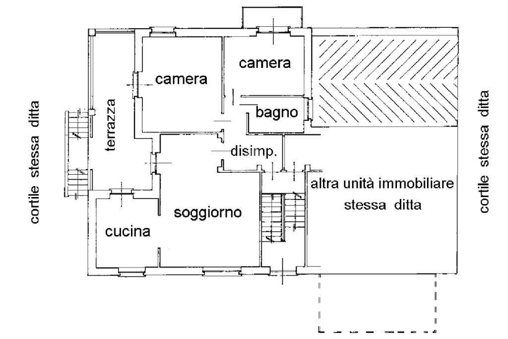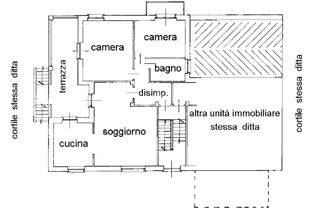 La soluzione presenta la parte abitativa su di un unico livello ed è composto da due unità abitative. La prima si dispone con tinello e cucinino, due camere e bagno; la seconda di cucina, camera e bagno. Al piano seminterrato locali adibiti a taverna e ripostiglio oltre un box auto singolo.